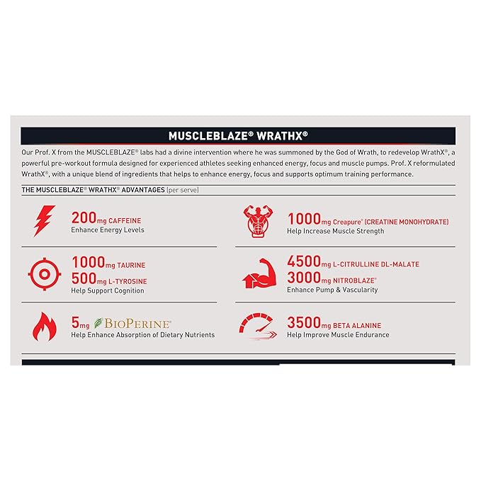 Take your performance to the next level with MuscleBlaze Pre-Workout WrathX — a powerful blend designed for both men and women who want to push their limits in the gym.