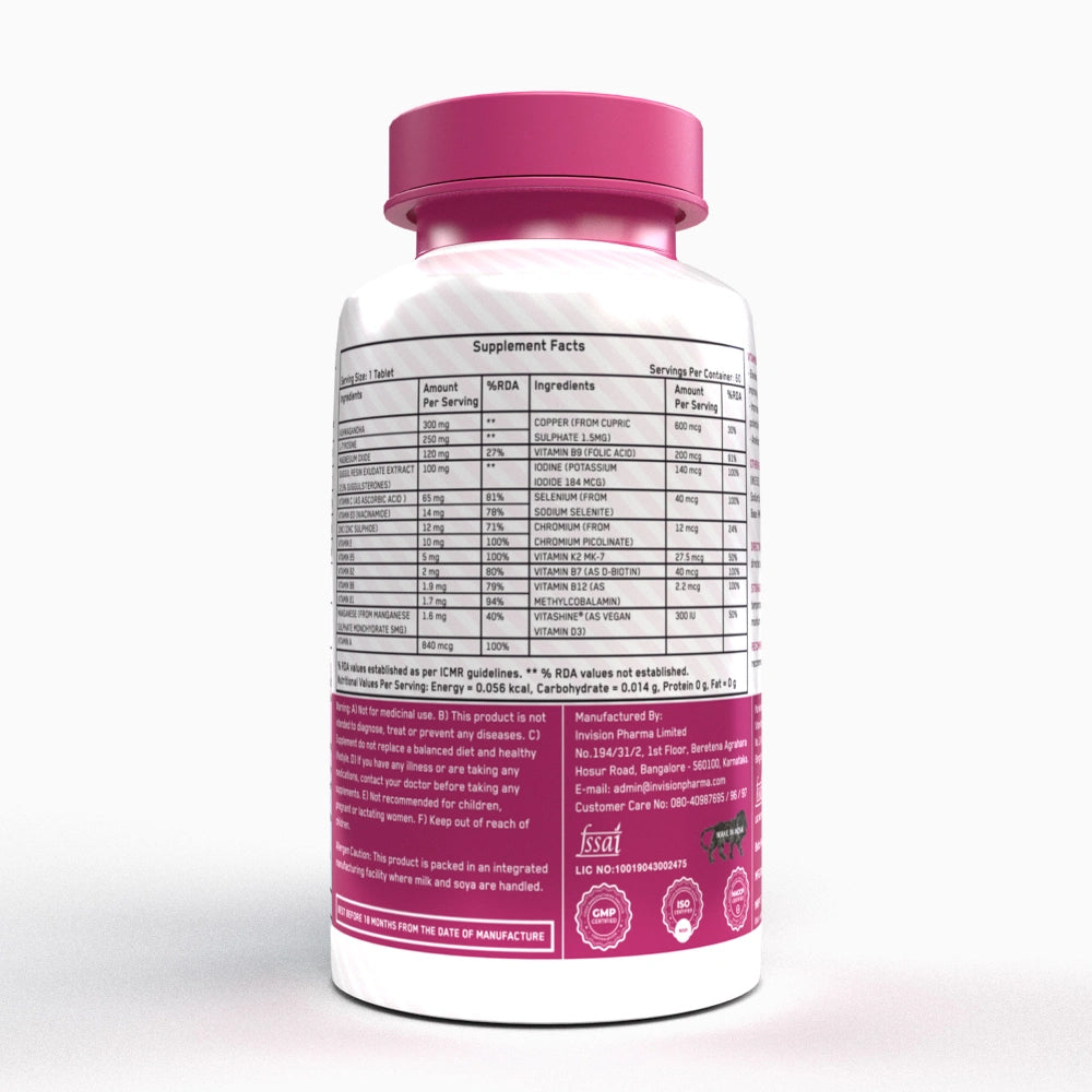 Anticaking Agent (INS 551), Glazing Agent (INS 553), Glidant (INS 470), Starch, Dicalcium Phosphate, Sodium Starch Glycolate, Class II Preservative, and Coating Base: HPMC (INS E464), Approved Artificial Color.